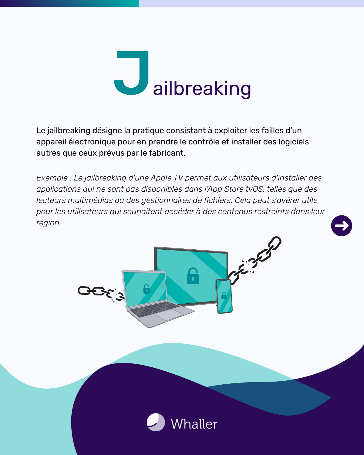 Le jailbreaking désigne la pratique consistant à exploiter les failles d’un appareil électronique pour en prendre le contrôle et installer des logiciels autres que ceux prévus par le fabricant. Avec un accès complet à son système d’exploitation, le propriétaire peut installer des applications non approuvées et personnaliser complètement leur interface. Le terme « jailbreaking » est généralement associé à l’iPhone d’Apple.
