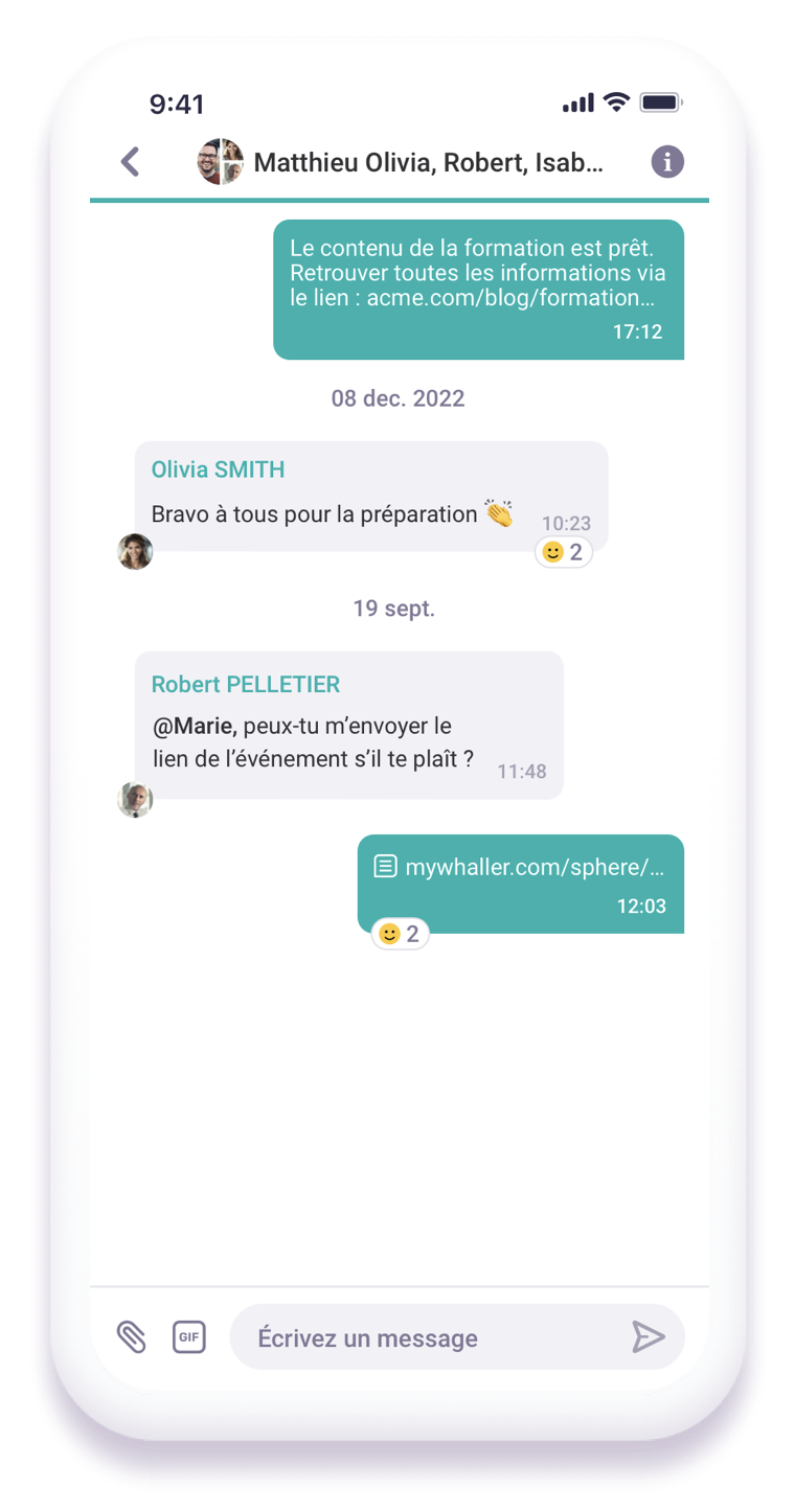 Pour surmonter ces défis, Whaller a mis au point « Discussions », une solution de messagerie instantanée favorisant des échanges en temps réel. Accessible depuis le web et sur mobile, « Discussions » se distingue par son interface conviviale et intuitive, assurant une collaboration et une connexion aisées entre les membres de votre réseau, quel que soit leur localisation.