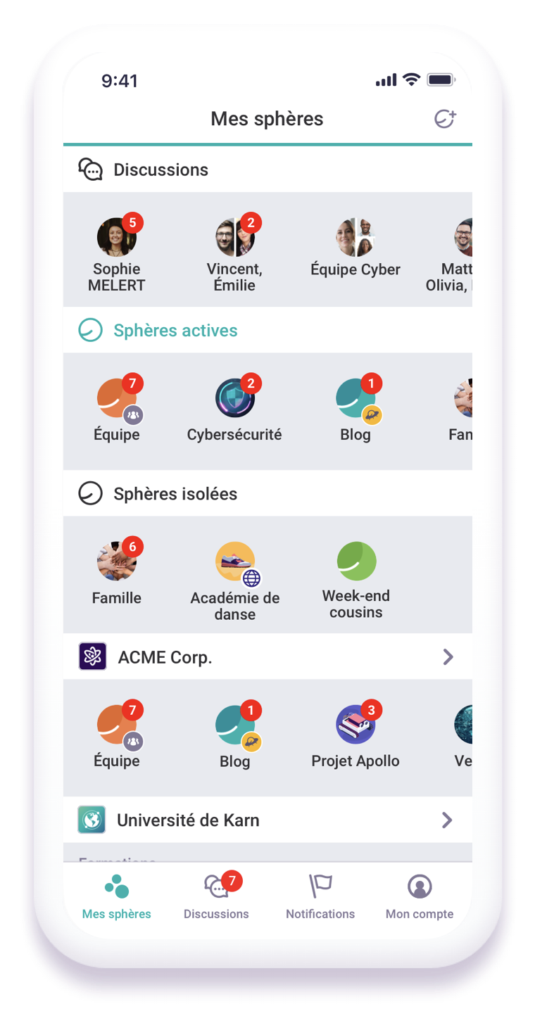 - Conversations 1 to 1 et de groupe : Initiez des discussions privées ou des conversations de groupe, et même des groupes inter-réseaux.