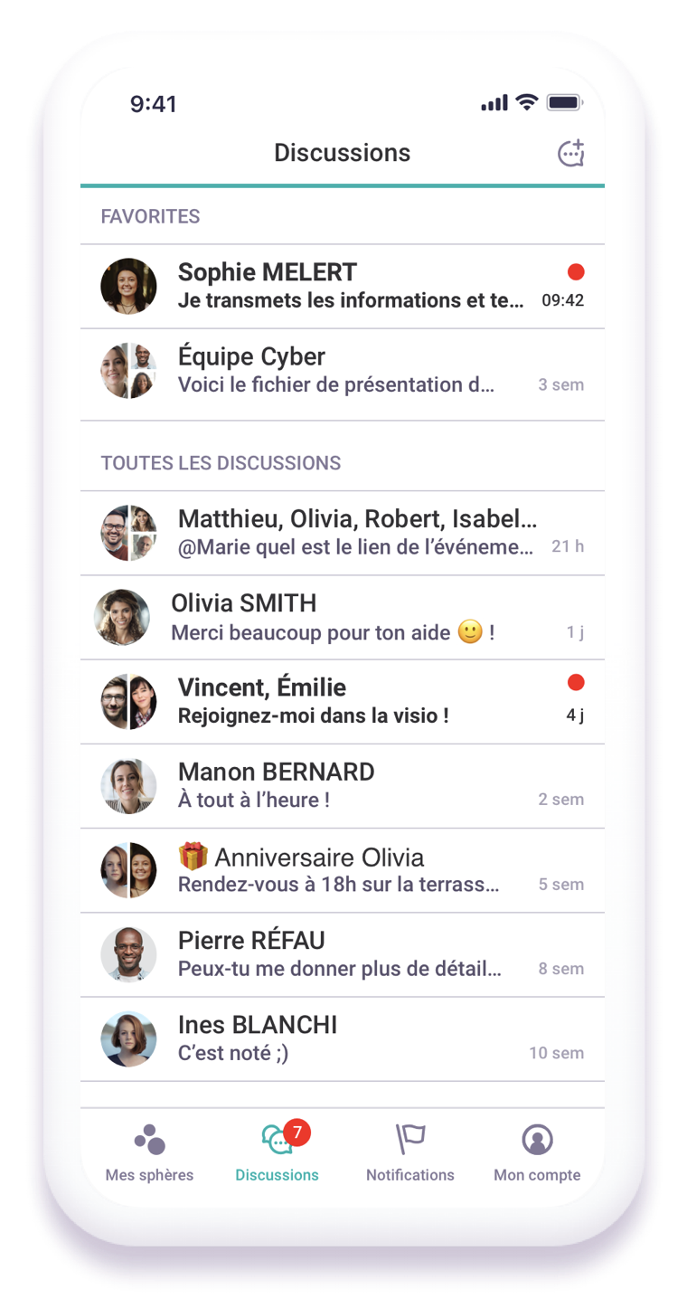 Marquez certaines discussions comme favorites pour un accès rapide, visualisez en un instant tous les participants, et personnalisez vos échanges pour une pertinence accrue.