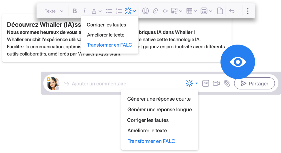 L’éditeur de messages de Whaller est également amélioré par Whaller (IA)ssistant, avec des outils de correction automatique, des suggestions d’amélioration de texte, et une option de transformation en langage Facile À Lire et à Comprendre (FALC), rendant les communications plus accessibles et impactantes. Ces avancées facilitent la rédaction, libérant du temps pour des tâches plus cruciales.